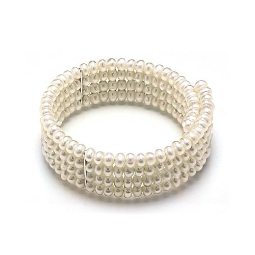 With four refined rows of 6mm button freshwater pearls, this necklace is sure to glam up any outfit. Here's a step-by-step breakdown of how to get your House of Windsor on! Sport some polished silver links for a high-flossin' look. After you're done, breeze through our wedding pearl jewelry for complimentary pieces guaranteed to make bridesmaids be like, "whoa." The stunning necklace will comfortably fit neck sizes between 13 and 17 inches. This quality piece is AA Graded, which ensures a high luster and no surface markings.