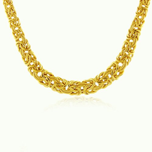 Necklace is a lovely way to dress up your look. Jewelry is crafted of fine sterling silver with 14 k gold plating. This necklace features a bold, graduated Byzantine link design. The Byzantine link is one of the oldest and strongest links in jewelry. Necklace measures 18" and secures with a safe and user-friendly lobster claw clasp.